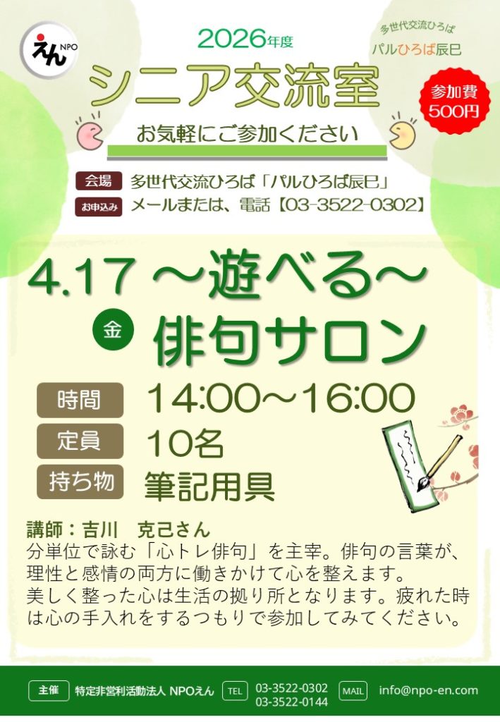 2026年度シニア交流室の新企画として「~遊べる~俳句サロン」を開催します。詳しくは、お知らせをご覧ください。